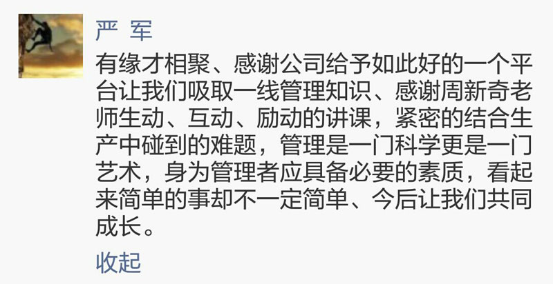 培訓結束之后,參加培訓的一線班組長們反應熱烈,都表示收獲很多。今后,百聯(lián)還將繼續(xù)推進內(nèi)部提升,全員加油,促進企業(yè)持續(xù)發(fā)展。