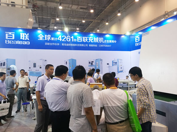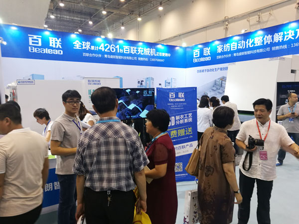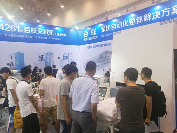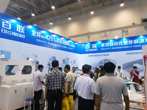 本屆青島展期間,百聯(lián)位于H3館A07的展位如往年一樣人氣滿滿,除了展示X型模塊化自動充絨機、402D全自動絨棉一體機之外,還重點展示了全新研發(fā)的1208型全自動充棉枕芯機。