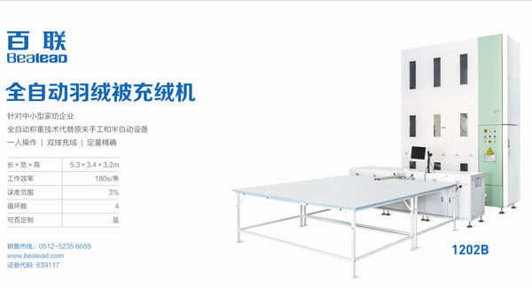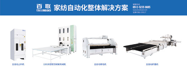 今年以來,百聯整合家紡自動化產品資源,針對羽絨被、枕頭、靠墊等家紡產品的應用需求,推出了可個性化定制的家紡充填類自動化整體解決方案。這些產品主要涉及全自動上料機、羽絨被充絨機、被子折疊機、打包機等,形成了完整的家紡自動化流水線,幫助客戶企業(yè)提高生產效率、降低人力成本、提高產品質量,為實現“智能工廠”及“智能生產”提供了有力的保障。