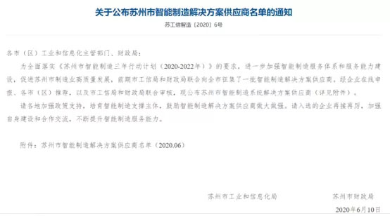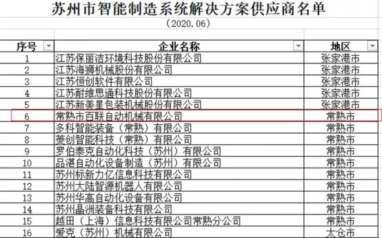 近日,蘇州市工信局公布了《蘇州市智能制造解決方案供應(yīng)商》的名單,全市共有141家企業(yè)入選,其中常熟市10家。我司(常熟市百聯(lián)自動(dòng)機(jī)械有限公司)入選在列!