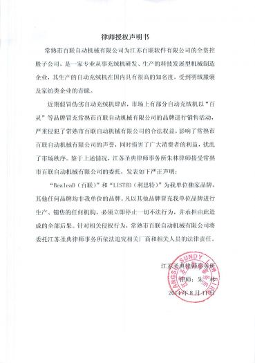 “BealeaD(百聯(lián))”和“LISTED(利思特)”為我單位獨(dú)家品牌,其他任何品牌均非我單位的品牌。凡以其他品牌冒充我單位品牌進(jìn)行生產(chǎn)、銷(xiāo)售的任何機(jī)構(gòu),必須立即停止一切不法行為,并承擔(dān)由此造成的全部后果。針對(duì)相關(guān)侵權(quán)行為,常熟市百聯(lián)自動(dòng)機(jī)械有限公司將委托江蘇圣典律師事務(wù)所依法追究相關(guān)廠商和相關(guān)人員的法律責(zé)任。